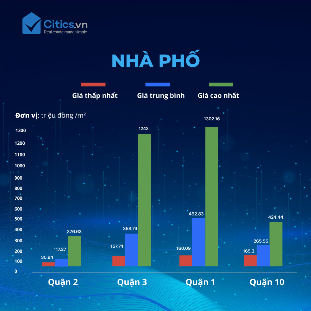 Trong khi đó, so với giá nhà phố trung bình quận 3, quận 2 thấp hơn 241,47 triệu/m2 và thấp hơn giá nhà phố trung bình quận 10 là 148,28 triệu/m2. Giá nhà phố quận 3 ghi nhận mức cao nhất đạt 1243 triệu đồng/m2 và quận 10 ghi nhật mức giá 424,44 triệu đồng/m2.