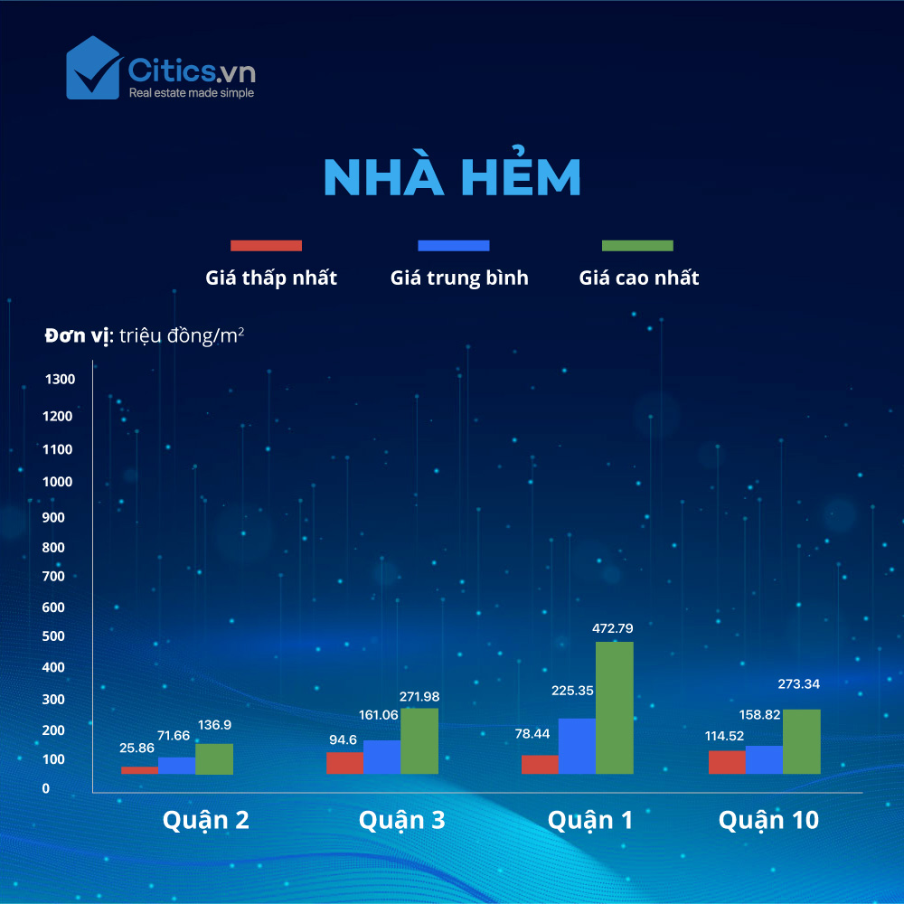 Về nhà hem, giá trung bình tại quận 2 đang ghi nhận ở mức 71,66 triệu đồng/m2, cao nhất là 136,9 triệu đồng/m2 và giá thấp nhất là 25,86 triệu đồng/m2. Tuyến đường có nhà hẻm cao nhất là đường Nguyễn Đăng Giai với mức 136,897,799 đồng/m2 và đường Lê Phụng Hiểu có mức giá nhà hẻm thấp nhất, ở mức 25,860,000 đồng/m2.