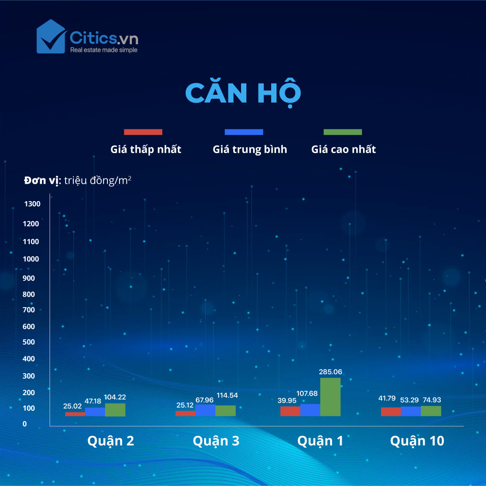 Ở phân khúc căn hộ, giá căn hộ trung bình quận 2 ở mức 47,18 triệu đồng/m2. Trong khi đó, giá căn hộ trung bình tại quận 3 ở mức 67,96 triệu đồng/m2, quận 1 là 107,68 triệu đồng/m2 và quận 10 là 53,29 triệu đồng/m2.