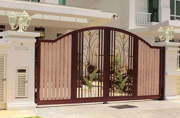 Thiết kế đơn giản từ gỗ và sắt là một ý tưởng tương đối tuyệt vời cho không gian ngoại thất. Với gam màu nâu kết hợp cùng màu trắng hồng thanh lịch và họa tiết mềm mại tinh tế, mẫu cổng biệt thự sân vườn này có thể phù hợp với rất nhiều không gian khác nhau.